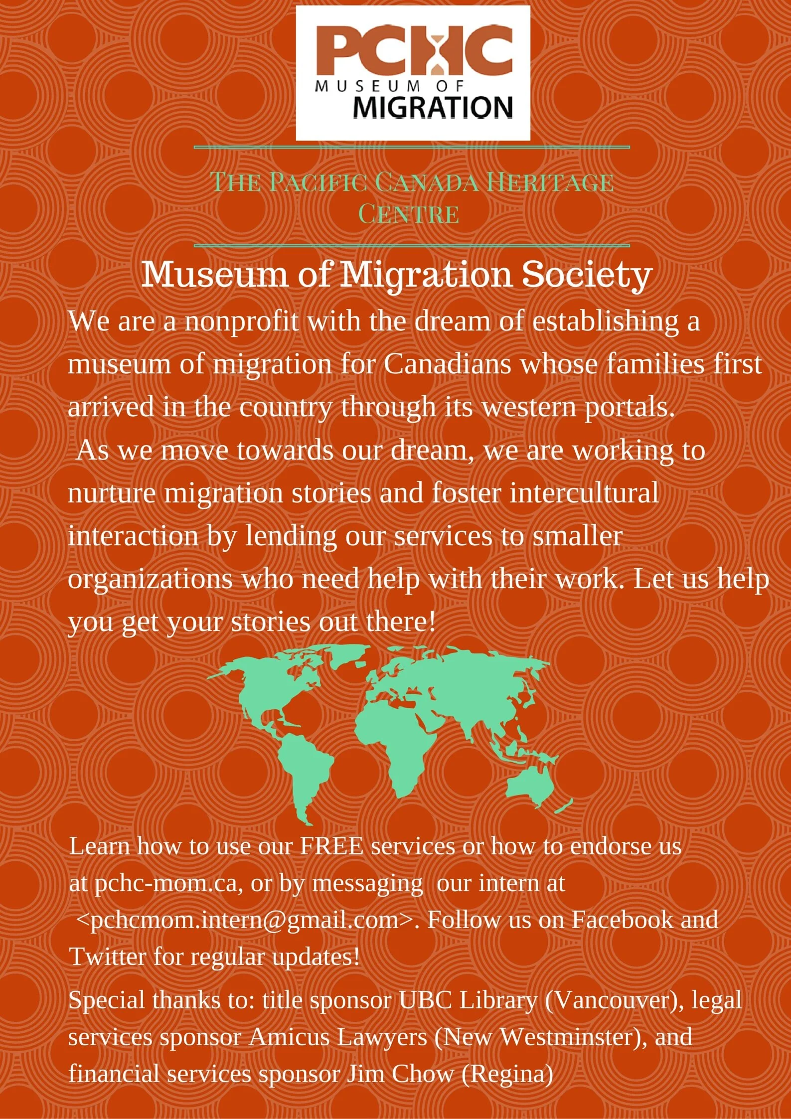 Form, News PCHC-MoM Society 2016-08-08 Form, News PCHC-MoM Society 2016-08-08 Become a Member of PCHC-MoM! Read More Media, PCHC Interview PCHC-MoM Society 2016-03-08 Media, PCHC Interview PCHC-MoM Society 2016-03-08 Project 40 Interview with PCHC-MoM Read More PCHC-MoM Family Histor... PCHC-MoM Society 2016-01-11 PCHC-MoM Family Histor... PCHC-MoM Society 2016-01-11 Archive Your Family Story with PCHC-MoM Read More Media PCHC-MoM Society 2015-12-21 Media PCHC-MoM Society 2015-12-21 Happy Holidays from PCHC-MoM Read More Community Events, Honour, Media, Photo Gallery PCHC-MoM Society 2015-11-23 Community Events, Honour, Media, Photo Gallery PCHC-MoM Society 2015-11-23 BC Multicultural Inspirational Talks Read More Arts and Culture, Media, PCHC-MoM Partner Events PCHC-MoM Society 2015-10-08 Arts and Culture, Media, PCHC-MoM Partner Events PCHC-MoM Society 2015-10-08 PCHC-MoM/Ricepaper Magazine Partnership Issue Released Read More Media PCHC-MoM Society 2015-08-10 Media PCHC-MoM Society 2015-08-10 PCHC-MoM Poster Read More Community Events, PCHC-MoM Partner Events PCHC-MoM Society 2015-05-11 Community Events, PCHC-MoM Partner Events PCHC-MoM Society 2015-05-11 Immigrant Seniors: What it Takes to Call Canada Home Read More News PCHC-MoM Society 2015-03-14 News PCHC-MoM Society 2015-03-14 Musqueam Chief and Council Support PCHC - Museum of Migration Read More News PCHC-MoM Society 2015-01-23 News PCHC-MoM Society 2015-01-23 An Introduction to the Pacific Canada Heritage Centre - Museum of Migration Read More News, Photo Gallery PCHC-MoM Society 2015-01-23 News, Photo Gallery PCHC-MoM Society 2015-01-23 PCHC Inaugural Symposium Read More News PCHC-MoM Society 2015-01-23 News PCHC-MoM Society 2015-01-23 We Need To Extend Pier 21 Across Canada Read More