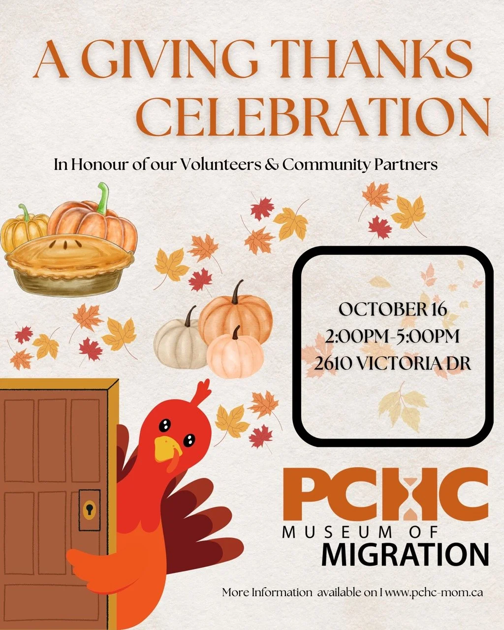 Giving Thanks Celebration Thursday, October 16, 2025 2:00 p.m. 5:00 p.m. ISS of BC Welcome Centre 2610 Victoria Drive Vancouver, BC, V5N 4L2 Canada (map) Google Calendar ICS Join us at our Giving Thanks CelebrationWe’ll come together to share gratitude, enjoy seasonal treats, and celebrate the spirit of community that continues to support our mission of preserving and sharing migration stories.